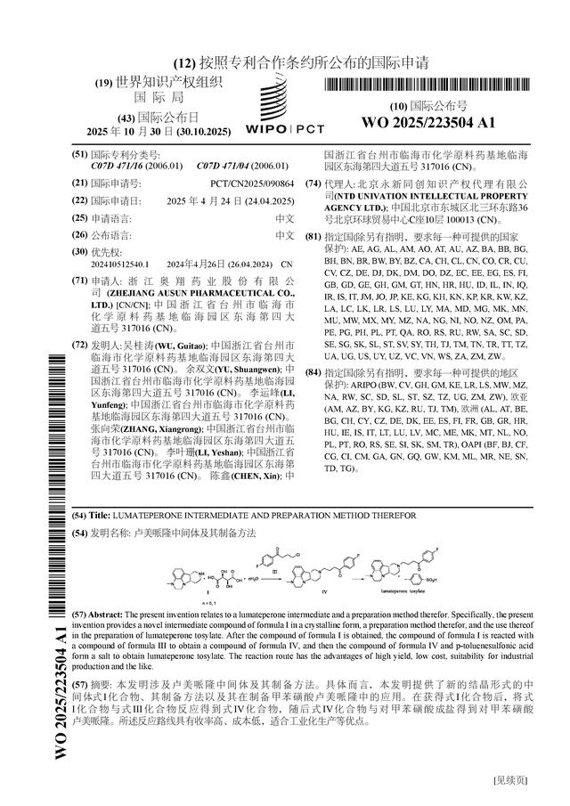 证券之星消息,根据企查查数据显示奥翔药业(603229)公布了一项国际专利申请,专利名为“卢美哌隆中间体及其制备方法”,专利申请号为PCT/CN2025/090864,国际公布日为2025年10月30日。