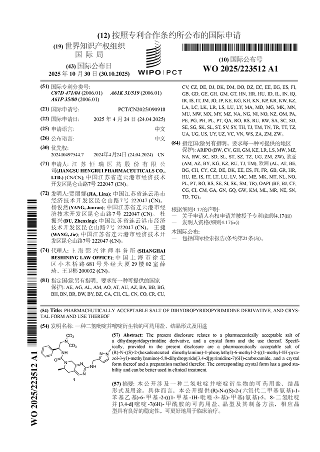 证券之星消息,根据企查查数据显示恒瑞医药(600276)公布了一项国际专利申请,专利名为“一种二氢吡啶并嘧啶衍生物的可药用盐、结晶形式及用途”,专利申请号为PCT/CN2025/090918,国际公布日为2025年10月30日。