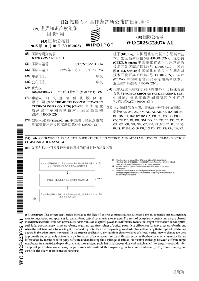 证券之星消息,根据企查查数据显示烽火通信(600498)公布了一项国际专利申请,专利名为“一种多波段光通信系统的运维监控方法及装置”,专利申请号为PCT/CN2025/081214,国际公布日为2025年10月30日。