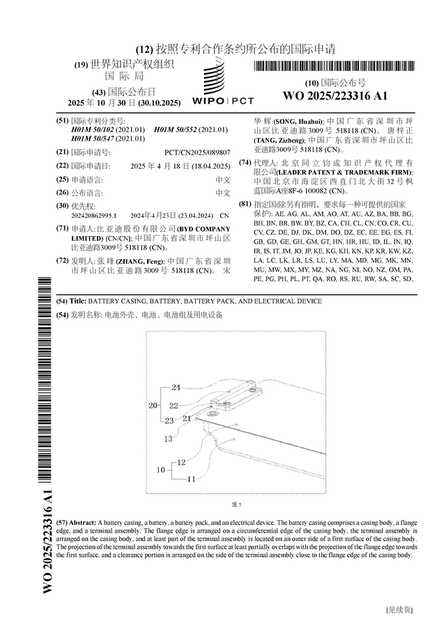 证券之星消息,根据企查查数据显示比亚迪(002594)公布了一项国际专利申请,专利名为“电池外壳、电池、电池组及用电设备”,专利申请号为PCT/CN2025/089807,国际公布日为2025年10月30日。