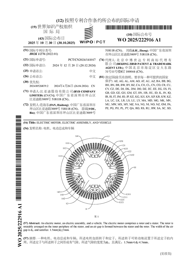 证券之星消息,根据企查查数据显示比亚迪(002594)公布了一项国际专利申请,专利名为“电机、电动总成和车辆”,专利申请号为PCT/CN2024/141017,国际公布日为2025年10月30日。