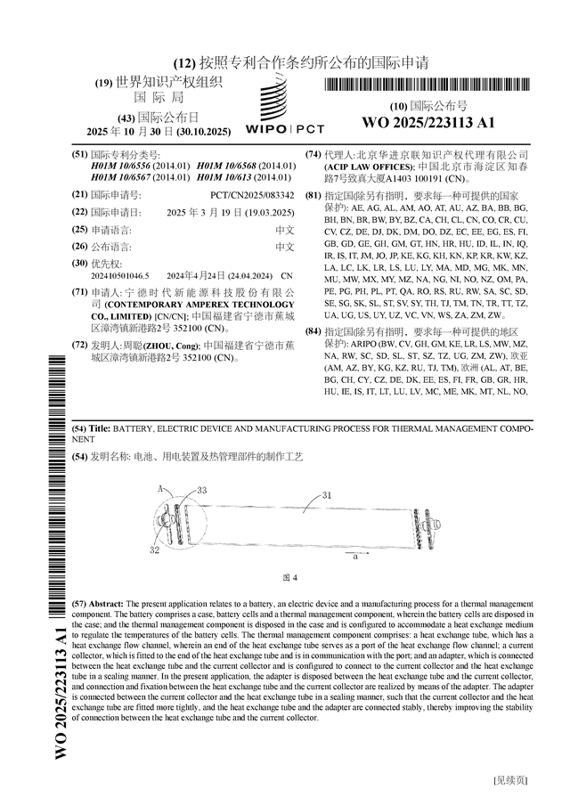 证券之星消息,根据企查查数据显示宁德时代(300750)公布了一项国际专利申请,专利名为“电池、用电装置及热管理部件的制作工艺”,专利申请号为PCT/CN2025/083342,国际公布日为2025年10月30日。