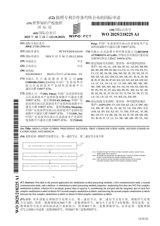 证券之星消息,根据企查查数据显示中兴通讯(000063)公布了一项国际专利申请,专利名为“调制符号处理方法、第一通信节点、第二通信节点及介质”,专利申请号为PCT/CN2024/141110,国际公布日为2025年10月23日。