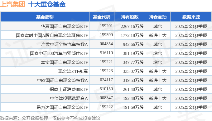 持有上汽集团最多的基金为华夏国证自由现金流ETF,目前规模为44.54亿元,最新净值1.173(10月31日),较上一交易日下跌0.66%。该基金现任基金经理为杨斯琪。