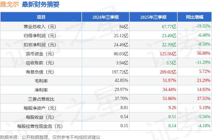 据证券之星公开数据整理,近期雅戈尔(600177)发布2025年三季报。截至本报告期末,公司营业总收入67.77亿元,同比下降19.32%,归母净利润23.49亿元,同比下降6.48%。按单季度数据看,第三季度营业总收入16.66亿元,同比下降38.05%,第三季度归母净利润6.34亿元,同比下降1.99%。本报告期雅戈尔三费占比上升明显,财务费用、销售费用和管理费用总和占总营收同比增幅达37.55%。