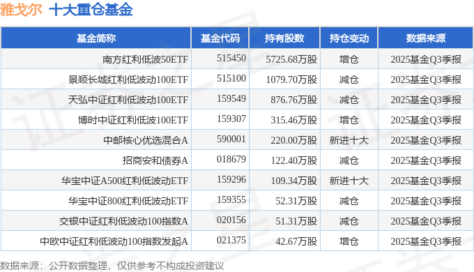 持有雅戈尔最多的基金为南方红利低波50ETF,目前规模为127.39亿元,最新净值1.4444(10月31日),较上一交易日下跌0.48%,近一年上涨12.51%。该基金现任基金经理为崔蕾。