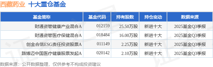持有西藏药业最多的基金为财通资管健康产业混合A,目前规模为1.18亿元,最新净值1.1645(10月31日),较上一交易日上涨3.73%,近一年上涨31.97%。该基金现任基金经理为易小金。