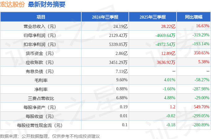 据证券之星公开数据整理,近期宏达股份(600331)发布2025年三季报。截至本报告期末,公司营业总收入28.22亿元,同比上升16.63%,归母净利润-4669.64万元,同比下降319.29%。按单季度数据看,第三季度营业总收入10.11亿元,同比上升53.71%,第三季度归母净利润2829.81万元,同比上升176.38%。本报告期宏达股份公司应收账款体量较大,当期应收账款占最新年报归母净利润比达100.72%。