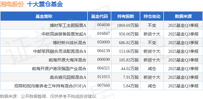 持有湘电股份最多的基金为博时军工主题股票A,目前规模为24.48亿元,最新净值1.943(10月30日),较上一交易日下跌2.17%,近一年上涨41.21%。该基金现任基金经理为曾鹏。