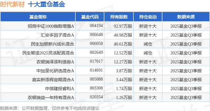 持有时代新材最多的基金为招商中证1000指数增强A,目前规模为10.12亿元,最新净值2.0763(10月30日),较上一交易日下跌1.26%,近一年上涨38.18%。该基金现任基金经理为蔡振。
