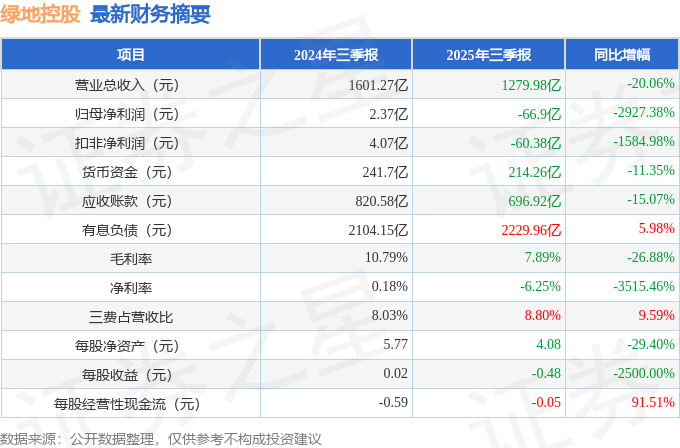 据证券之星公开数据整理,近期绿地控股(600606)发布2025年三季报。根据财报显示,绿地控股净利润同比下降2927.38%。截至本报告期末,公司营业总收入1279.98亿元,同比下降20.06%,归母净利润-66.9亿元,同比下降2927.38%。按单季度数据看,第三季度营业总收入333.09亿元,同比下降25.47%,第三季度归母净利润-31.83亿元,同比下降11912.36%。