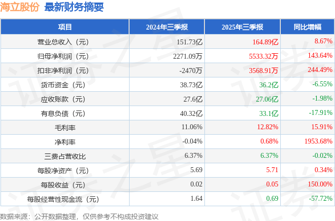 据证券之星公开数据整理,近期海立股份(600619)发布2025年三季报。截至本报告期末,公司营业总收入164.89亿元,同比上升8.67%,归母净利润5533.32万元,同比上升143.64%。按单季度数据看,第三季度营业总收入40.63亿元,同比下降3.08%,第三季度归母净利润2197.86万元,同比上升18.75%。本报告期海立股份盈利能力上升,毛利率同比增幅10.93%,净利率同比增幅1953.68%。