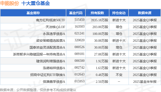 持有申能股份最多的基金为南方红利低波50ETF,目前规模为127.39亿元,最新净值1.4444(10月31日),较上一交易日下跌0.48%,近一年上涨12.51%。该基金现任基金经理为崔蕾。
