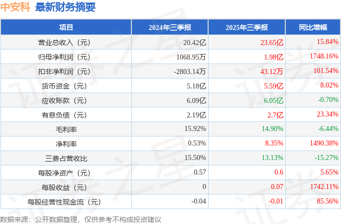 据证券之星公开数据整理,近期中安科(600654)发布2025年三季报。截至本报告期末,公司营业总收入23.65亿元,同比上升15.84%,归母净利润1.98亿元,同比上升1748.16%。按单季度数据看,第三季度营业总收入8.11亿元,同比上升11.5%,第三季度归母净利润1.95亿元,同比上升1454.32%。本报告期中安科公司应收账款体量较大,当期应收账款占最新年报归母净利润比达3021.46%。