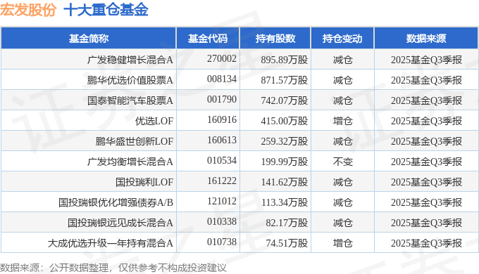 持有宏发股份最多的基金为广发稳健增长混合A,目前规模为101.66亿元,最新净值1.6398(10月31日),较上一交易日下跌0.39%,近一年上涨10.86%。该基金现任基金经理为傅友兴 周智硕。