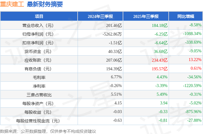 据证券之星公开数据整理,近期重庆建工(600939)发布2025年三季报。截至本报告期末,公司营业总收入184.18亿元,同比下降8.58%,归母净利润-6.25亿元,同比下降1088.34%。按单季度数据看,第三季度营业总收入40.57亿元,同比下降10.55%,第三季度归母净利润-3.76亿元,同比下降1014.13%。本报告期重庆建工短期债务压力上升,流动比率达0.94。