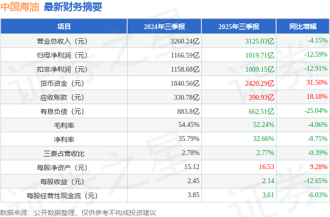 据证券之星公开数据整理,近期中国海油(600938)发布2025年三季报。根据财报显示,中国海油净利润同比下降12.59%。截至本报告期末,公司营业总收入3125.03亿元,同比下降4.15%,归母净利润1019.71亿元,同比下降12.59%。按单季度数据看,第三季度营业总收入1048.95亿元,同比上升5.68%,第三季度归母净利润324.38亿元,同比下降12.16%。