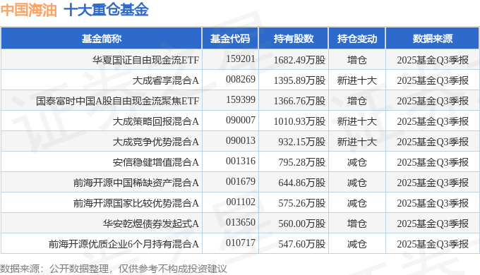 持有中国海油最多的基金为华夏国证自由现金流ETF,目前规模为44.54亿元,最新净值1.173(10月31日),较上一交易日下跌0.66%。该基金现任基金经理为杨斯琪。