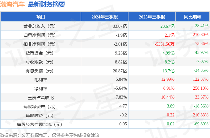 据证券之星公开数据整理,近期渤海汽车(600960)发布2025年三季报。截至本报告期末,公司营业总收入23.67亿元,同比下降28.41%,归母净利润2.1亿元,同比上升210.8%。按单季度数据看,第三季度营业总收入6.55亿元,同比下降33.03%,第三季度归母净利润-9136.77万元,同比下降19.75%。本报告期渤海汽车盈利能力上升,毛利率同比增幅73.23%,净利率同比增幅258.1%。