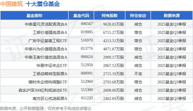 持有中国建筑最多的基金为中泰星元灵活配置混合A,目前规模为42.78亿元,最新净值2.8277(10月30日),较上一交易日下跌0.08%,近一年上涨8.57%。该基金现任基金经理为姜诚。