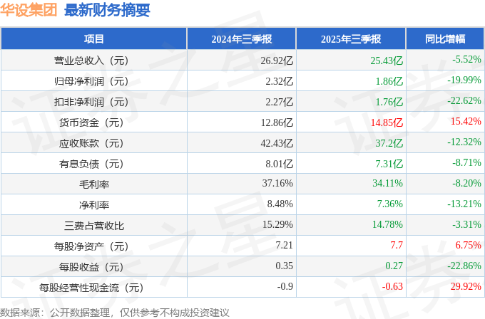 据证券之星公开数据整理,近期华设集团(603018)发布2025年三季报。截至本报告期末,公司营业总收入25.43亿元,同比下降5.52%,归母净利润1.86亿元,同比下降19.99%。按单季度数据看,第三季度营业总收入10.48亿元,同比上升1.64%,第三季度归母净利润8462.77万元,同比上升8.3%。本报告期华设集团公司应收账款体量较大,当期应收账款占最新年报归母净利润比达972.23%。