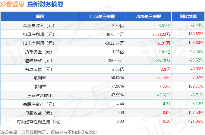 据证券之星公开数据整理,近期莎普爱思(603168)发布2025年三季报。截至本报告期末,公司营业总收入3.51亿元,同比下降2.44%,归母净利润2763.22万元,同比上升189.85%。按单季度数据看,第三季度营业总收入1.15亿元,同比下降6.54%,第三季度归母净利润576.94万元,同比上升195.54%。本报告期莎普爱思盈利能力上升,毛利率同比增幅7.02%,净利率同比增幅199.71%。