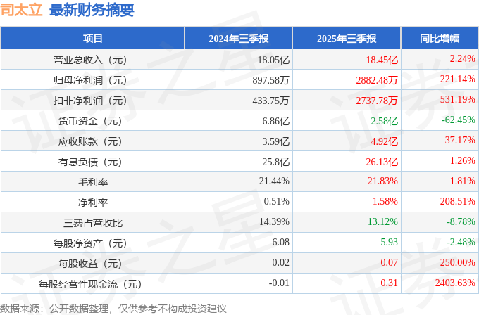 据证券之星公开数据整理,近期司太立(603520)发布2025年三季报。截至本报告期末,公司营业总收入18.45亿元,同比上升2.24%,归母净利润2882.48万元,同比上升221.14%。按单季度数据看,第三季度营业总收入4.47亿元,同比下降5.66%,第三季度归母净利润-31.06万元,同比上升97.77%。本报告期司太立短期债务压力上升,流动比率达0.89。