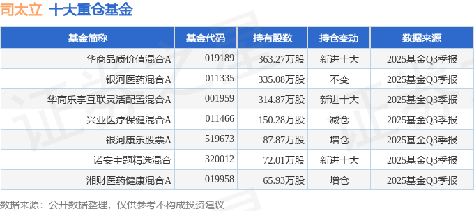 持有司太立最多的基金为华商品质价值混合A,目前规模为8.63亿元,最新净值1.7379(10月31日),较上一交易日下跌1.4%,近一年上涨54.69%。该基金现任基金经理为余懿。