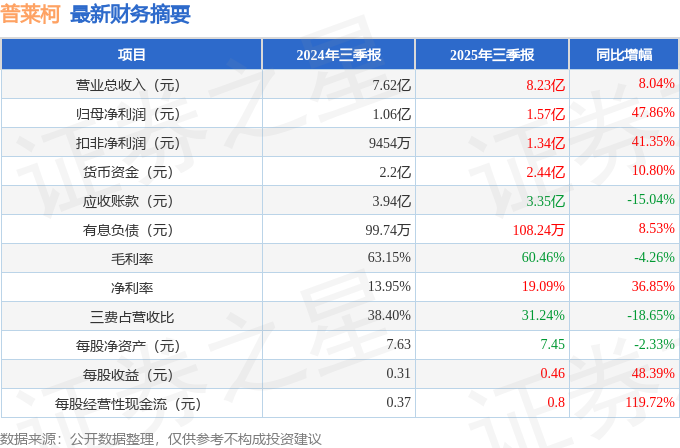 据证券之星公开数据整理,近期普莱柯(603566)发布2025年三季报。截至本报告期末,公司营业总收入8.23亿元,同比上升8.04%,归母净利润1.57亿元,同比上升47.86%。按单季度数据看,第三季度营业总收入2.64亿元,同比下降5.39%,第三季度归母净利润4095.33万元,同比上升26.69%。本报告期普莱柯公司应收账款体量较大,当期应收账款占最新年报归母净利润比达360.99%。