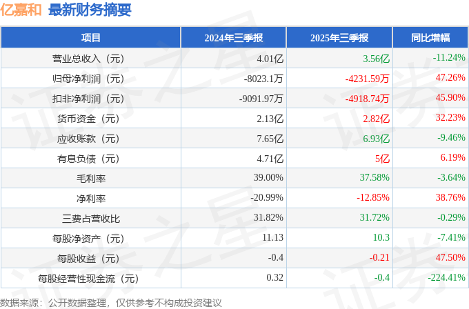 据证券之星公开数据整理,近期亿嘉和(603666)发布2025年三季报。截至本报告期末,公司营业总收入3.56亿元,同比下降11.24%,归母净利润-4231.59万元,同比上升47.26%。按单季度数据看,第三季度营业总收入8820.67万元,同比下降65.97%,第三季度归母净利润-2252.86万元,同比下降569.05%。本报告期亿嘉和公司应收账款体量较大,当期应收账款占最新年报营业总收入比达118.39%。