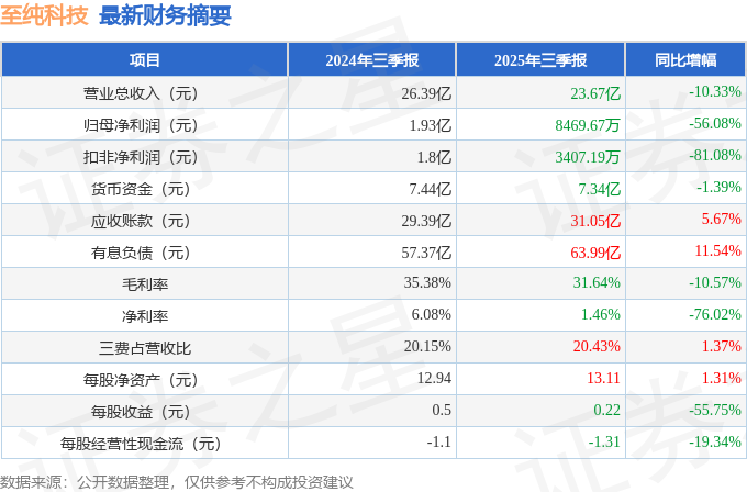 据证券之星公开数据整理,近期至纯科技(603690)发布2025年三季报。截至本报告期末,公司营业总收入23.67亿元,同比下降10.33%,归母净利润8469.67万元,同比下降56.08%。按单季度数据看,第三季度营业总收入7.59亿元,同比下降31.74%,第三季度归母净利润4537.8万元,同比下降61.91%。本报告期至纯科技公司应收账款体量较大,当期应收账款占最新年报归母净利润比达13160%。