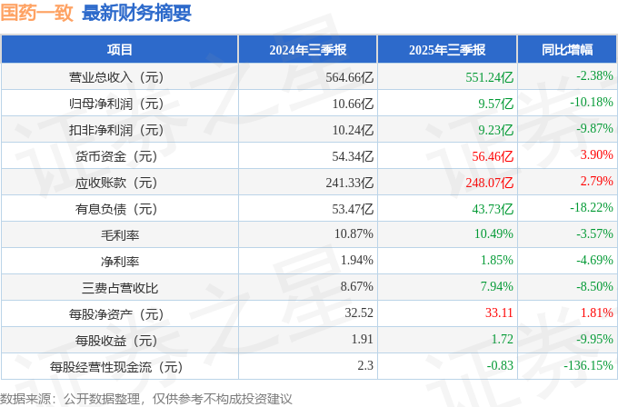 据证券之星公开数据整理,近期国药一致(000028)发布2025年三季报。根据财报显示,国药一致净利润同比下降10.18%。截至本报告期末,公司营业总收入551.24亿元,同比下降2.38%,归母净利润9.57亿元,同比下降10.18%。按单季度数据看,第三季度营业总收入183.28亿元,同比下降1.89%,第三季度归母净利润2.91亿元,同比下降9.58%。