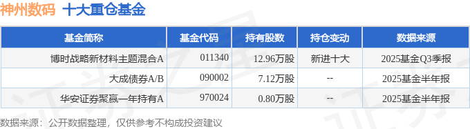 持有神州数码最多的基金为博时战略新材料主题混合A,目前规模为0.66亿元,最新净值1.1106(10月31日),较上一交易日下跌0.08%,近一年上涨29.85%。该基金现任基金经理为王晗。