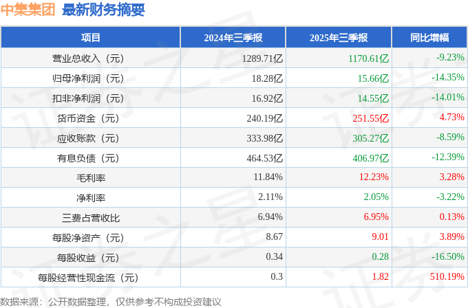 据证券之星公开数据整理,近期中集集团(000039)发布2025年三季报。截至本报告期末,公司营业总收入1170.61亿元,同比下降9.23%,归母净利润15.66亿元,同比下降14.35%。按单季度数据看,第三季度营业总收入409.7亿元,同比下降17.82%,第三季度归母净利润2.87亿元,同比下降70.13%。本报告期中集集团公司应收账款体量较大,当期应收账款占最新年报归母净利润比达1027.05%。