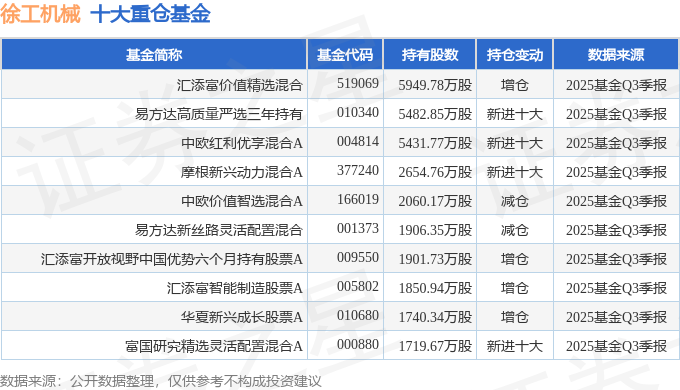 持有徐工机械最多的基金为汇添富价值精选混合,目前规模为92.65亿元,最新净值3.025(10月31日),较上一交易日下跌1.56%,近一年上涨21.75%。该基金现任基金经理为劳杰男。