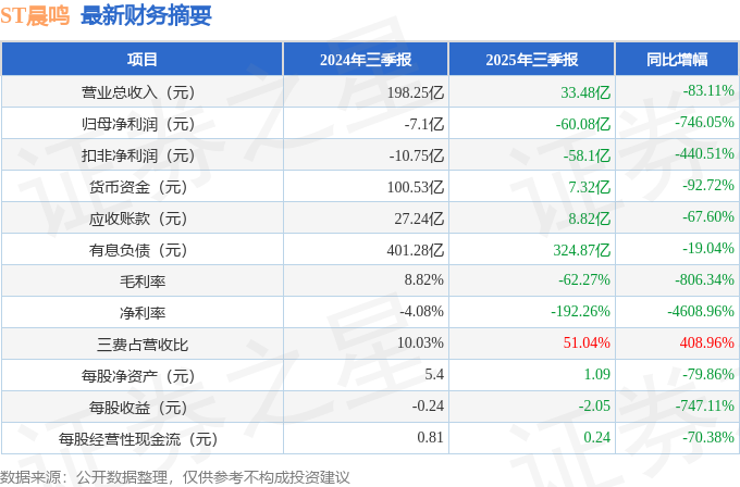 据证券之星公开数据整理,近期ST晨鸣(000488)发布2025年三季报。截至本报告期末,公司营业总收入33.48亿元,同比下降83.11%,归母净利润-60.08亿元,同比下降746.05%。按单季度数据看,第三季度营业总收入12.41亿元,同比下降79.1%,第三季度归母净利润-21.5亿元,同比下降191.02%。本报告期ST晨鸣三费占比上升明显,财务费用、销售费用和管理费用总和占总营收同比增幅达408.96%。