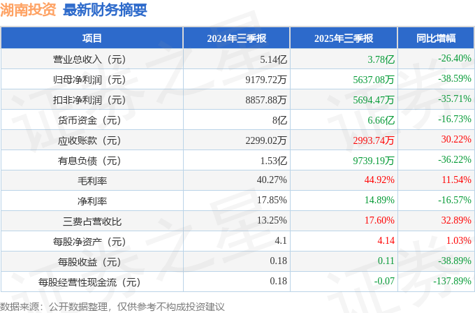 据证券之星公开数据整理,近期湖南投资(000548)发布2025年三季报。截至本报告期末,公司营业总收入3.78亿元,同比下降26.4%,归母净利润5637.08万元,同比下降38.59%。按单季度数据看,第三季度营业总收入1.16亿元,同比下降10.53%,第三季度归母净利润2040.2万元,同比下降27.56%。本报告期湖南投资三费占比上升明显,财务费用、销售费用和管理费用总和占总营收同比增幅达32.89%。