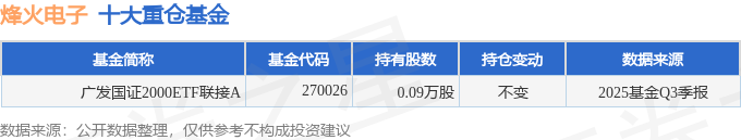 持有烽火电子最多的基金为广发国证2000ETF联接A,目前规模为1.17亿元,最新净值1.5866(10月31日),较上一交易日上涨0.53%,近一年上涨32.51%。该基金现任基金经理为霍华明。