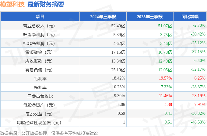 据证券之星公开数据整理,近期模塑科技(000700)发布2025年三季报。截至本报告期末,公司营业总收入51.07亿元,同比下降2.7%,归母净利润3.75亿元,同比下降30.42%。按单季度数据看,第三季度营业总收入17.08亿元,同比上升0.52%,第三季度归母净利润8177.69万元,同比下降54.79%。本报告期模塑科技公司应收账款体量较大,当期应收账款占最新年报归母净利润比达199.35%。