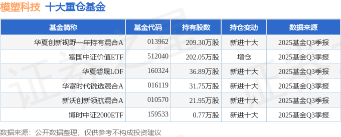 持有模塑科技最多的基金为华夏创新视野一年持有混合A,目前规模为3.67亿元,最新净值0.7635(10月31日),较上一交易日上涨0.29%,近一年上涨31.91%。该基金现任基金经理为刘洋。