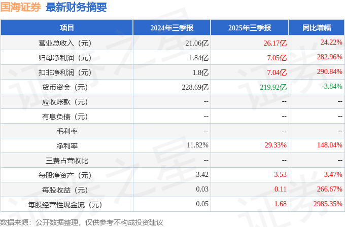 据证券之星公开数据整理,近期国海证券(000750)发布2025年三季报。根据财报显示,国海证券营收净利润同比双双增长。截至本报告期末,公司营业总收入26.17亿元,同比上升24.22%,归母净利润7.05亿元,同比上升282.96%。按单季度数据看,第三季度营业总收入10.3亿元,同比上升40.61%,第三季度归母净利润3.36亿元,同比上升707.54%。