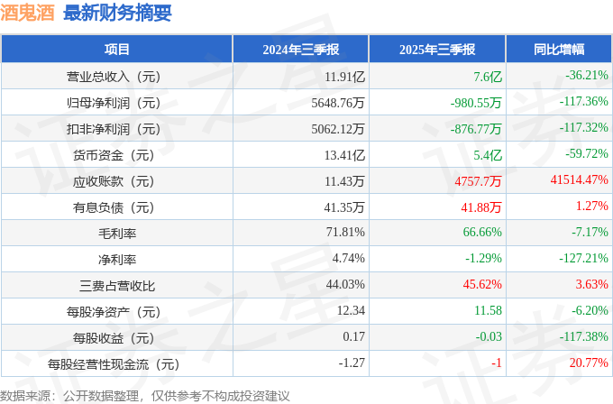 据证券之星公开数据整理,近期酒鬼酒(000799)发布2025年三季报。截至本报告期末,公司营业总收入7.6亿元,同比下降36.21%,归母净利润-980.55万元,同比下降117.36%。按单季度数据看,第三季度营业总收入1.98亿元,同比上升0.78%,第三季度归母净利润-1876.05万元,同比上升70.93%。本报告期酒鬼酒应收账款上升,应收账款同比增幅达41514.5%。