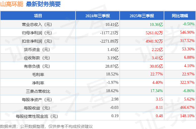 据证券之星公开数据整理,近期山高环能(000803)发布2025年三季报。截至本报告期末,公司营业总收入10.36亿元,同比下降0.5%,归母净利润5261.02万元,同比上升546.9%。按单季度数据看,第三季度营业总收入3.2亿元,同比上升27.06%,第三季度归母净利润1204.4万元,同比下降48.15%。本报告期山高环能短期债务压力上升,流动比率达0.42。
