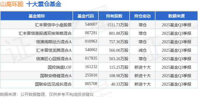 持有山高环能最多的基金为汇丰晋信中小盘股票,目前规模为14.93亿元,最新净值3.4199(10月31日),较上一交易日下跌0.53%,近一年上涨39.37%。该基金现任基金经理为郑小兵。