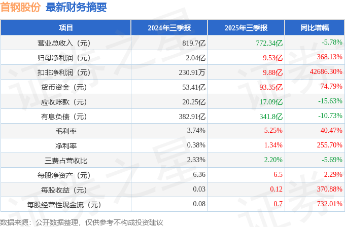 据证券之星公开数据整理,近期首钢股份(000959)发布2025年三季报。截至本报告期末,公司营业总收入772.34亿元,同比下降5.78%,归母净利润9.53亿元,同比上升368.13%。按单季度数据看,第三季度营业总收入247.16亿元,同比下降2.25%,第三季度归母净利润2.96亿元,同比上升255.06%。本报告期首钢股份盈利能力上升,毛利率同比增幅40.47%,净利率同比增幅255.7%。