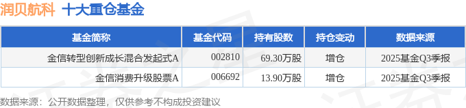 持有润贝航科最多的基金为金信转型创新成长混合发起式A,目前规模为1.28亿元,最新净值3.2896(10月31日),较上一交易日下跌1.37%,近一年上涨67.28%。该基金现任基金经理为杨超 黄飙。