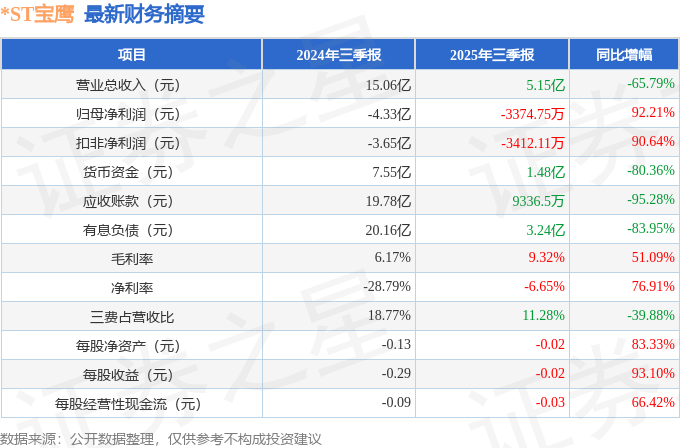 据证券之星公开数据整理,近期*ST宝鹰(002047)发布2025年三季报。截至本报告期末,公司营业总收入5.15亿元,同比下降65.79%,归母净利润-3374.75万元,同比上升92.21%。按单季度数据看,第三季度营业总收入2.03亿元,同比下降30.0%,第三季度归母净利润-998.92万元,同比上升95.24%。本报告期*ST宝鹰盈利能力上升,毛利率同比增幅51.09%,净利率同比增幅76.91%。