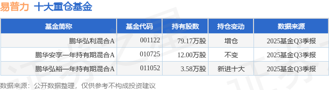 持有易普力最多的基金为鹏华弘利混合A,目前规模为5.4亿元,最新净值1.7475(10月31日),较上一交易日下跌0.22%,近一年上涨9.62%。该基金现任基金经理为李君。