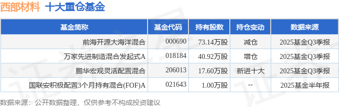 持有西部材料最多的基金为前海开源大海洋混合,目前规模为2.12亿元,最新净值1.601(10月31日),较上一交易日下跌0.19%,近一年下跌0.56%。该基金现任基金经理为刘宏。