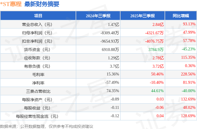 据证券之星公开数据整理,近期*ST惠程(002168)发布2025年三季报。截至本报告期末,公司营业总收入2.84亿元,同比上升93.13%,归母净利润-4321.67万元,同比上升47.99%。按单季度数据看,第三季度营业总收入1.04亿元,同比上升191.12%,第三季度归母净利润-1155.01万元,同比上升15.75%。本报告期*ST惠程盈利能力上升,毛利率同比增幅228.56%,净利率同比增幅81.91%。
